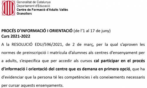 PROCÉS DE PREINSCRIPCIÓ I MATRÍCULA 2021-2022