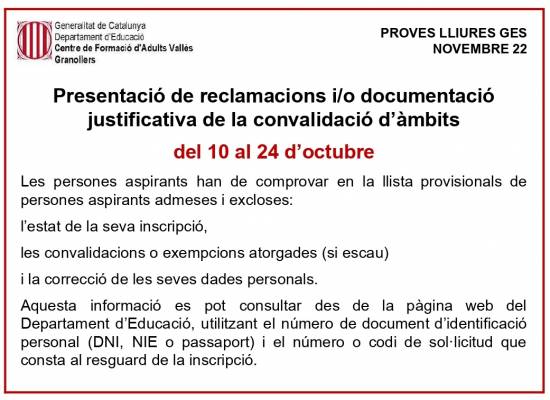 Presentació de reclamacions i/o documentació justificativa de la convalidació d’àmbits: del 07 al 21 de febrer
