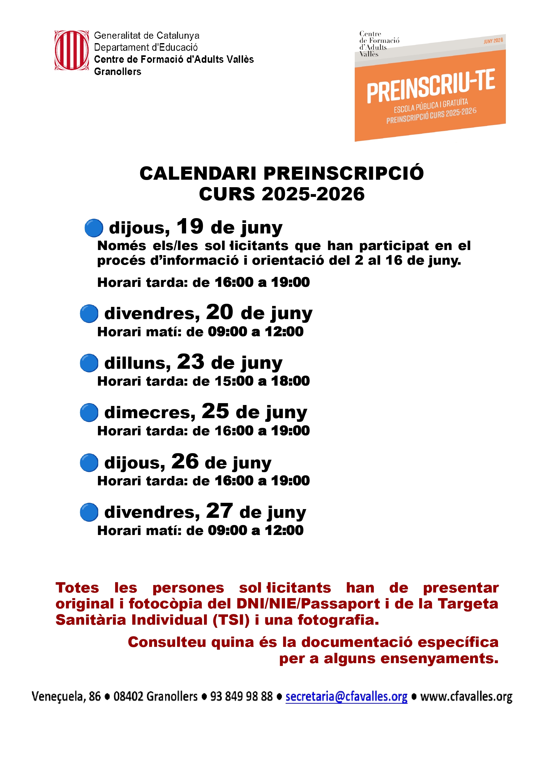PROCÉS DE PREINSCRIPCIÓ I MATRÍCULA 2025-2026