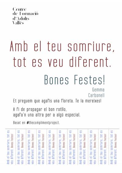 Es tracta de realitzar una adaptació del projecte #thecomplimentproject, que intenta propagar amabilitat i bon rotllo, i que ha estat ideat per l’artista Anna Seergeva en San Francisco.