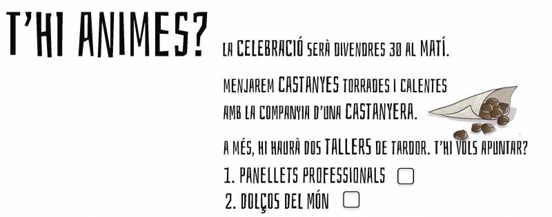 A les 11:30 celebrarem la nostra Castanyada de benvinguda a la tardor amb castanyes torrades i els dolços dels tallers.