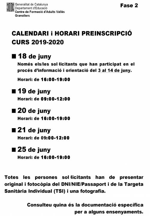 PROCÉS DE PREINSCRIPCIÓ I MATRÍCULA CURS 2019-2020