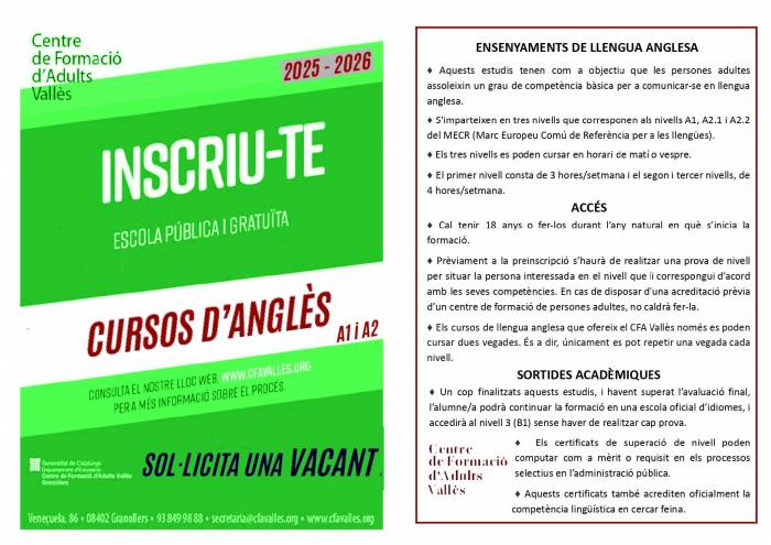 El CFA Vallès ofereix un curs de nivell 2 a la franja de matí i un altre a la de vespre.