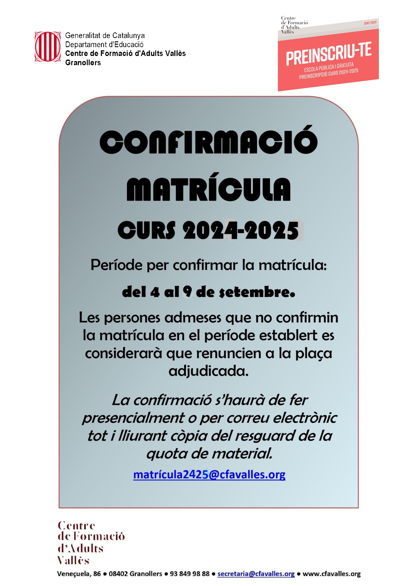 PROCÉS DE PREINSCRIPCIÓ I MATRÍCULA 2024-2025