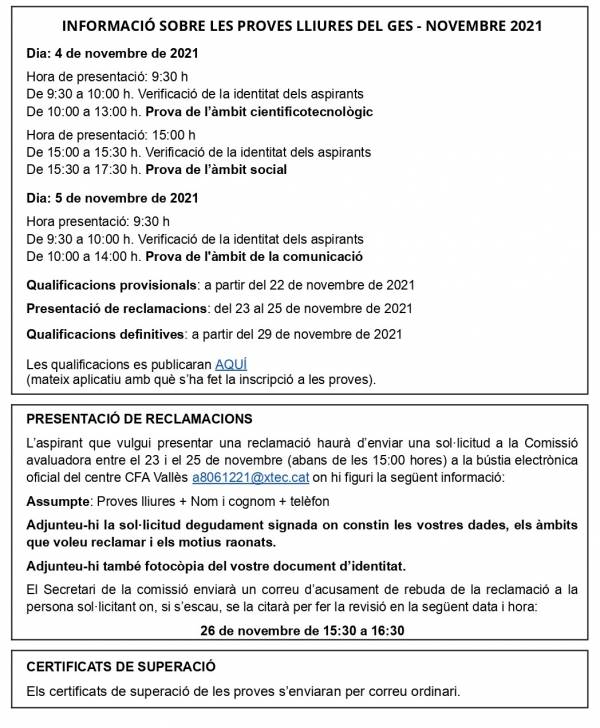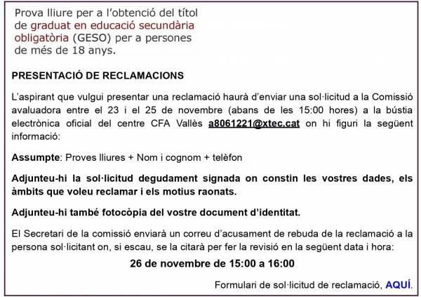 Durant els tres dies hàbils següents a la publicació de la llista provisional, els/les aspirants que hagin sol·licitat la convalidació d'àmbits mitjançant el formulari d'inscripció cal que presentin a la Secretaria del CFA Vallès l'original i la fotocòpia d'un dels documents següents que justifiqui la convalidació: