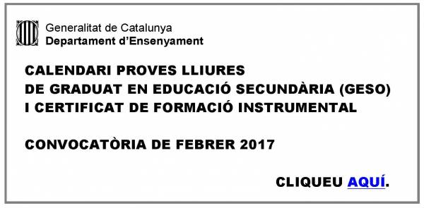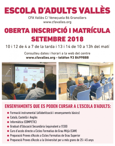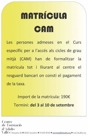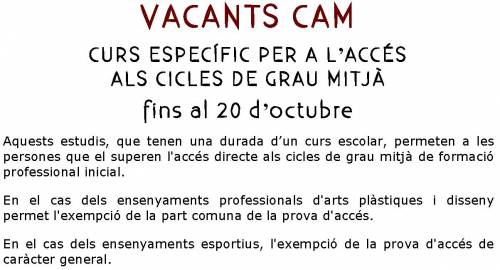 Per a orientació i vacants sobre els ensenyaments de GES (Graduat en Educació Secundària) i CAM (Curs d'Accés directe a CFGM) cliqueu AQUÍ.