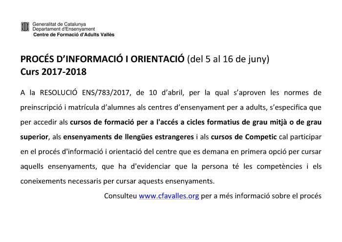 Per a orientació i vacants del Curs de preparació de les proves d'accés a CFGS i d'accés a la universitat, cliqueu AQUÍ.