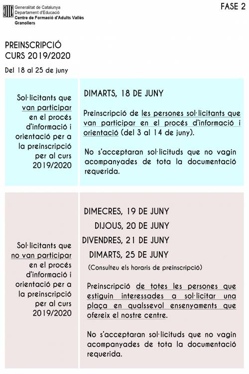 PROCÉS DE PREINSCRIPCIÓ I MATRÍCULA CURS 2019-2020