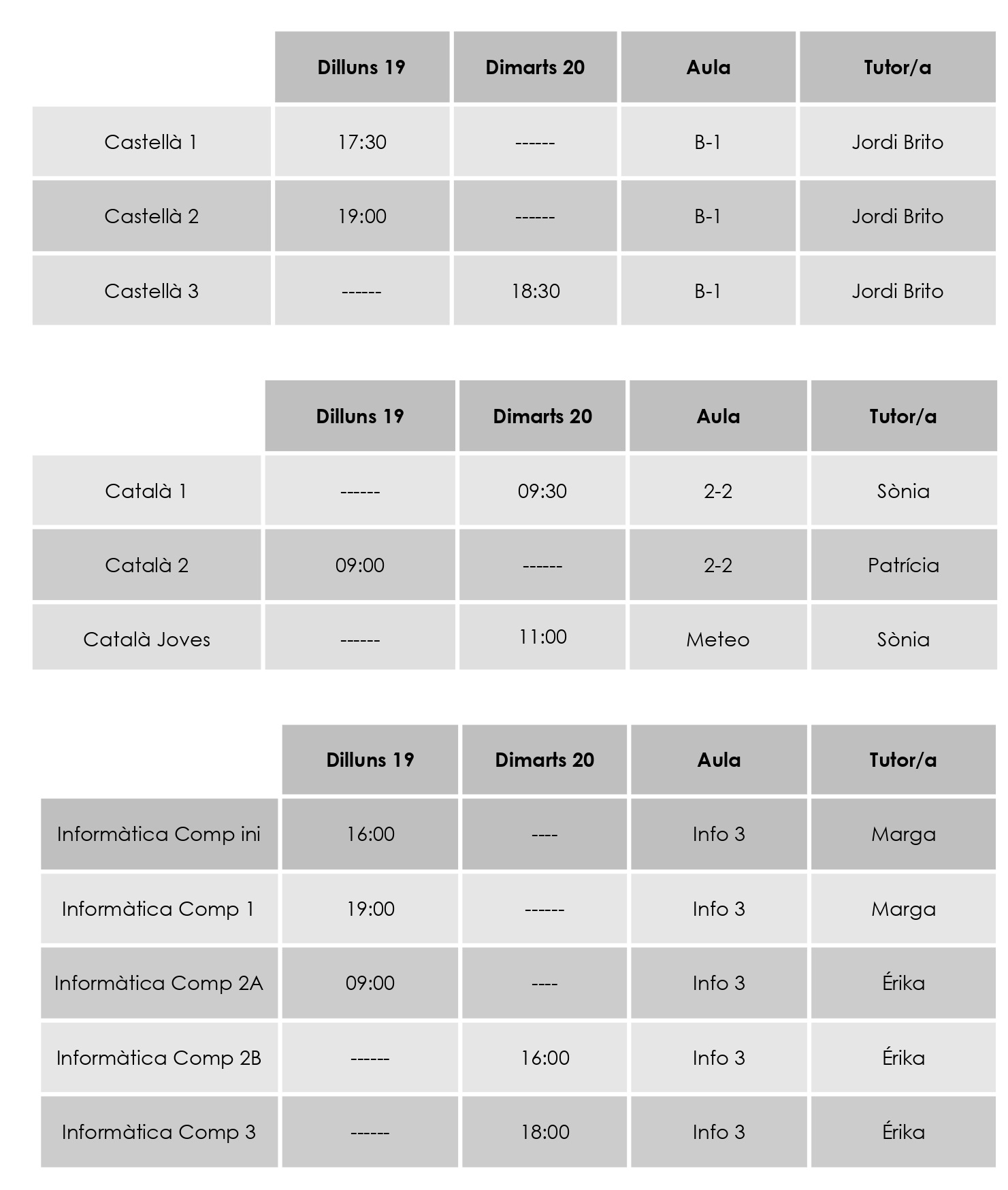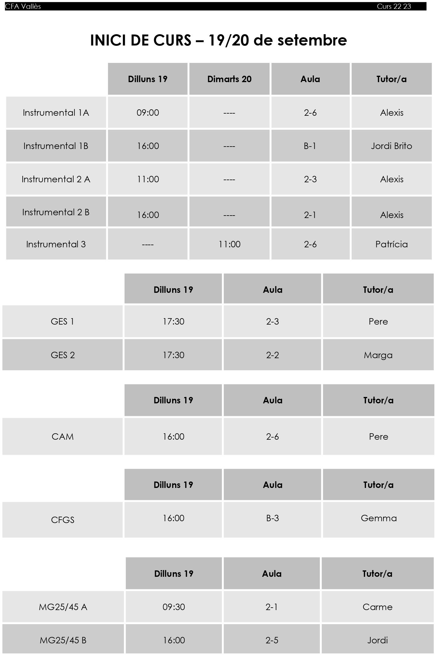 INICI DE CURS 22 23: DATA, HORARI, AULA I TUTOR/A