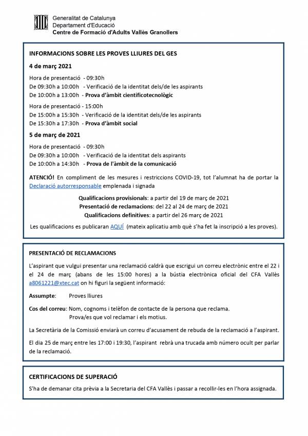 Consulta de resultats proves lliures GES - març 2021