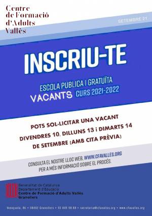 Cliqueu AQUÍ per conèixer l'oferta formativa, les places vacants i el calendari de preinscripció i matrícula.