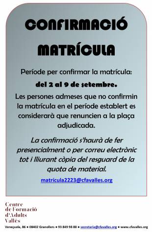 Cliqueu AQUÍ per a més informació sobre la confirmació de matrícula.