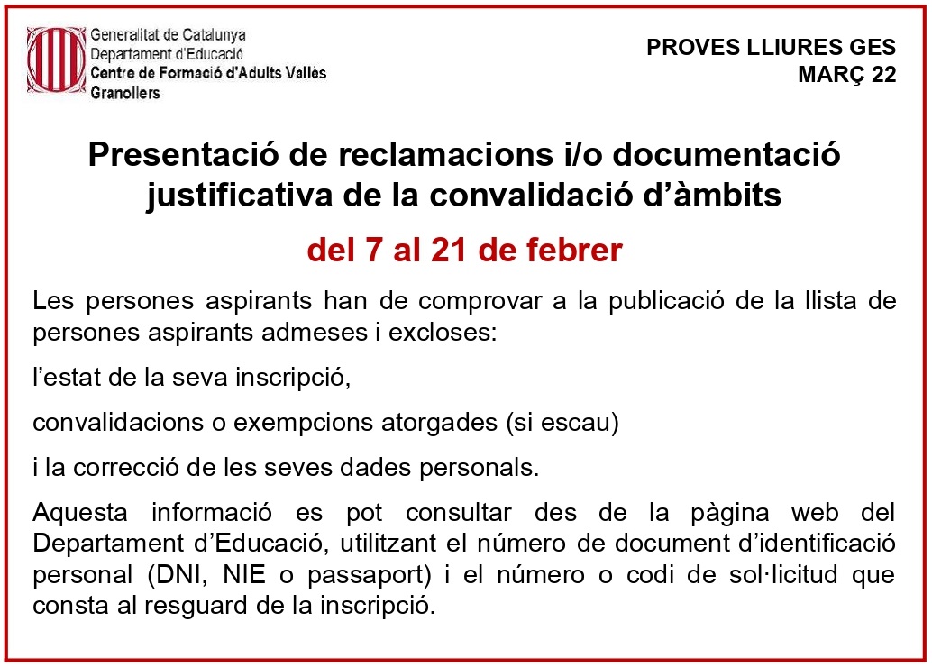 Presentació de reclamacions i/o documentació justificativa de la convalidació d’àmbits: del 07 al 21 de febrer