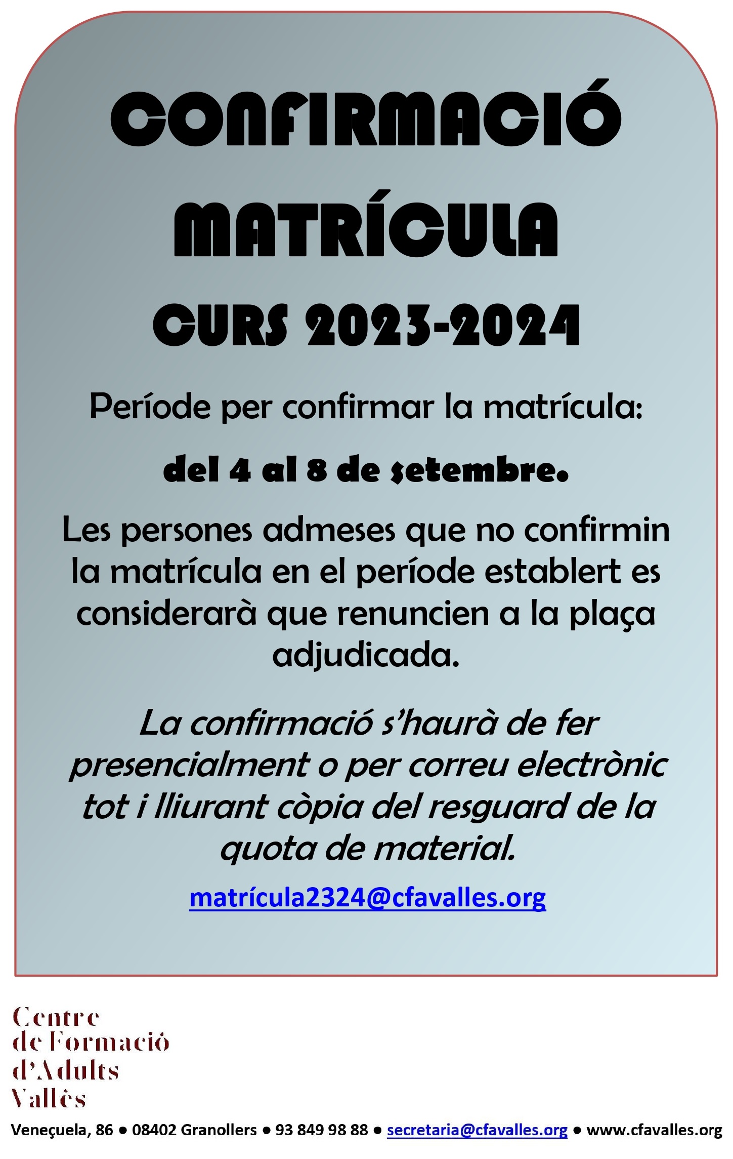 INSTRUCCIONS CONFIRMACIÓ MATRÍCULA 23 24 - TOTS ELS ENSENYAMENTS (EXCEPTE CAM)