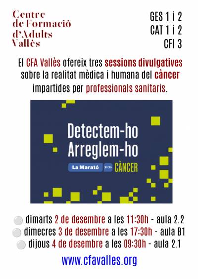 L'alumnat de GES, Català matí i CFI 3 assistirà a una sessió divulgativa de La Marató que enguany vol apropar la realitat mèdica i humana del càncer a la població.