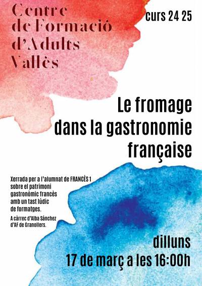 L'alumnat de FRANCÈS 1 participarà en una xerrada sobre el patrimoni gastronòmic francès. L'activitat inclourà un tast lúdic de formatges.