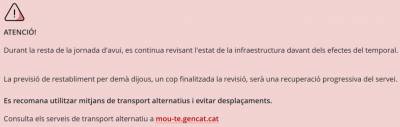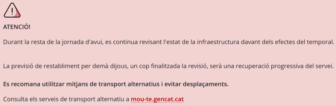 El descarrilament d'un tren a Gelida dimarts ha portat Renfe a suspendre el servei de Rodalies a tot Catalunya avui dimecres i que el desplaçament mitjançant aquest mitjà de transport sigui incert durant el dia de demà, dijous, en què ens havíem de desplaçar al Palau de la música utilitzant aquest transport.