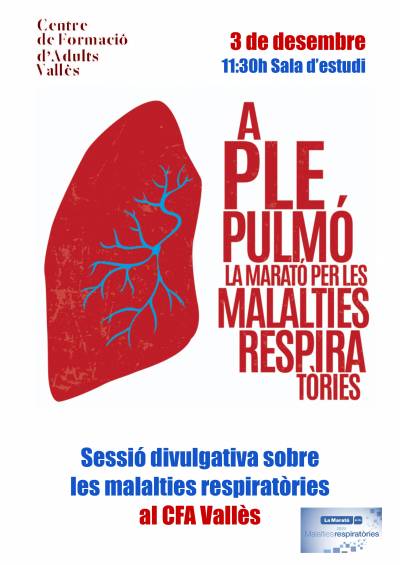 Convidem a tot l'alumnat del CFA Vallès a assistir a la sessió divulgativa sobre les malalties respiratòries A ple pulmó de La Marató de TV3 que tindrà lloc dimarts 3 de novembre a les 11:30h a la Sala d'actes del CFA Vallès.
