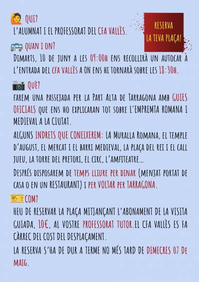 L'alumnat haurà de reservar la seva plaça mitjançant el seu professorat tutor.