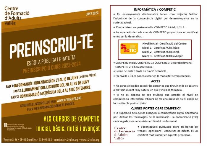 Els ensenyaments d'informàtica tenen com objectiu facilitar l'adquisició de la competència digital, entesa com la combinació de coneixements, habilitats i actituds en l'àmbit de les tecnologies de la informació i la comunicació (TIC) per desenvolupar-se en la societat actual. S'imparteixen en quatre nivells: COMPETIC Inicial, COMPETIC 1, COMPETIC 2 i COMPETIC 3.