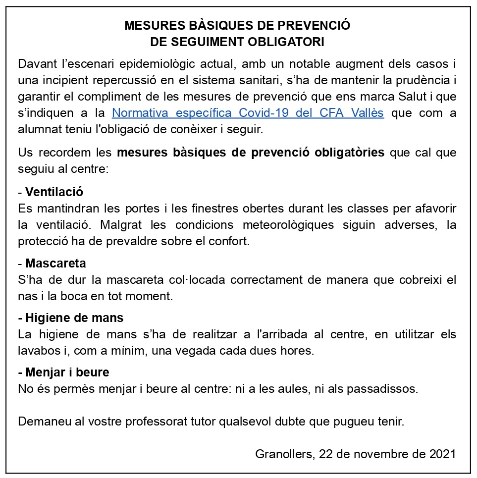 Us recordem també les mesures de prevenció bàsiques de seguiment obligatori perquè el nostre centre sigui un entorn segur, amb el mínim risc assumible: