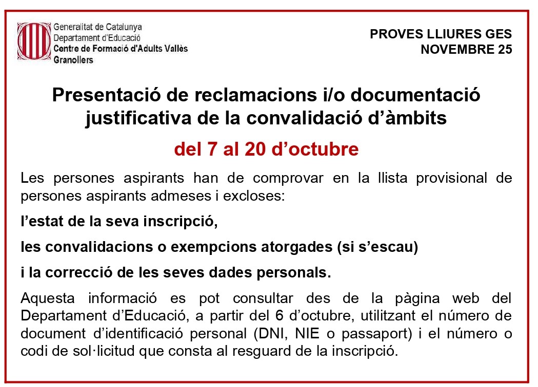 CALENDARI DE LES PROVES PER OBTENIR EL TÍTOL EN GRADUAT EN EDUCACIÓ SECUNDÀRIA OBLIGATÒRIA - CONVOCATÒRIA NOVEMBRE 2025