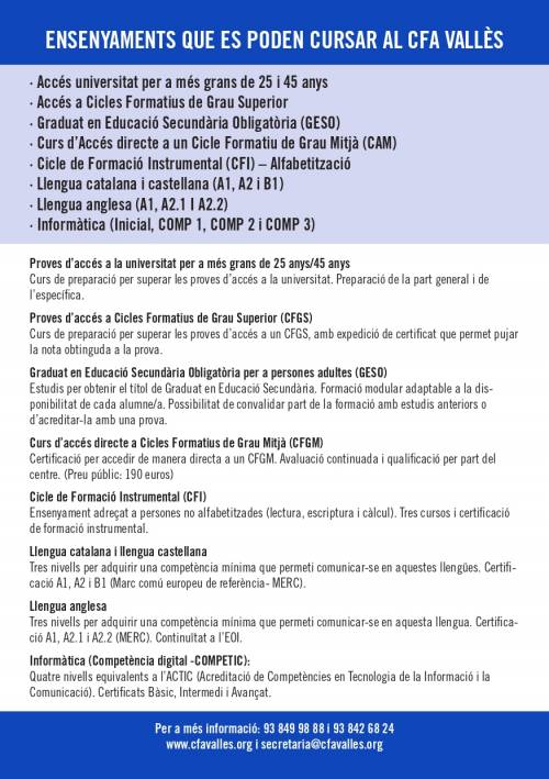 Per a informació sobre els ensenyaments que es cursen al nostre centre i els horaris, cliqueu AQUÍ.