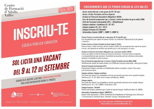 Si esteu interessats/ades en rebre informació i orientació sobre els nostres estudis i sobre com sol·licitar una vacant per al curs 24 25, cliqueu AQUÍ.